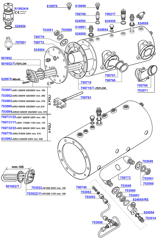 Heating element 3/4-group 5000w 220/380v 570 mm